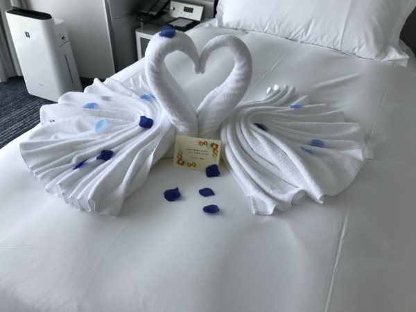 8月8日リゾートトラストの、ラグーナ蒲郡にかぞくでいきました。部屋に入ると、ベットの上にご覧のようなデコレイションがしてありました。。先日副院長(息子)の披露宴の余興に流した映像に、ラグーナを使わせていただきましたが、少し宣伝になったのか?喜んでもらい、嬉しかったです。犯人は、私の友達で、リゾートに勤めています。