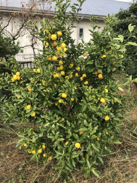 今年は豊作でした。隣にあるミカンの木は、今年はぜんぜんなりません。去年ほうさくでした。