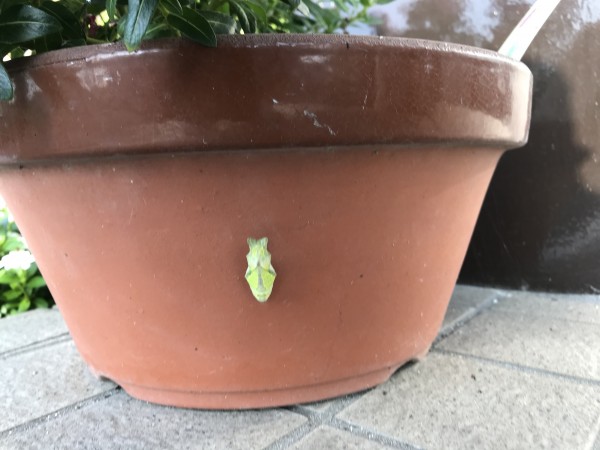 診療所の、玄関まえの、植木鉢の横に、さなぎ?がいます。